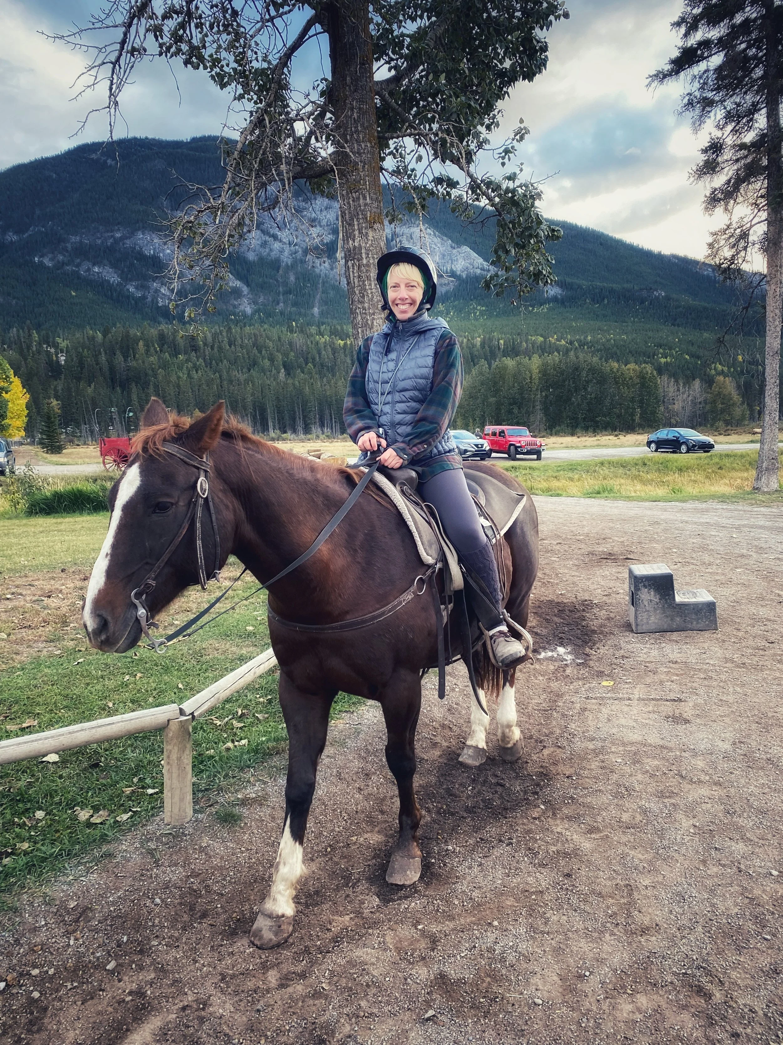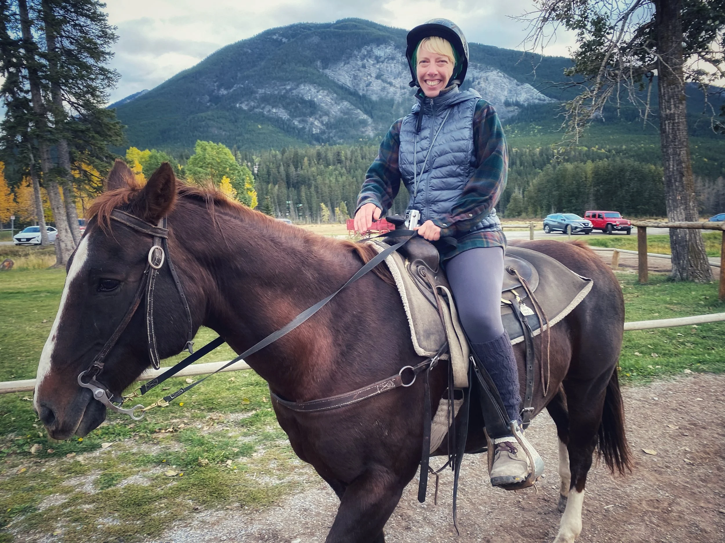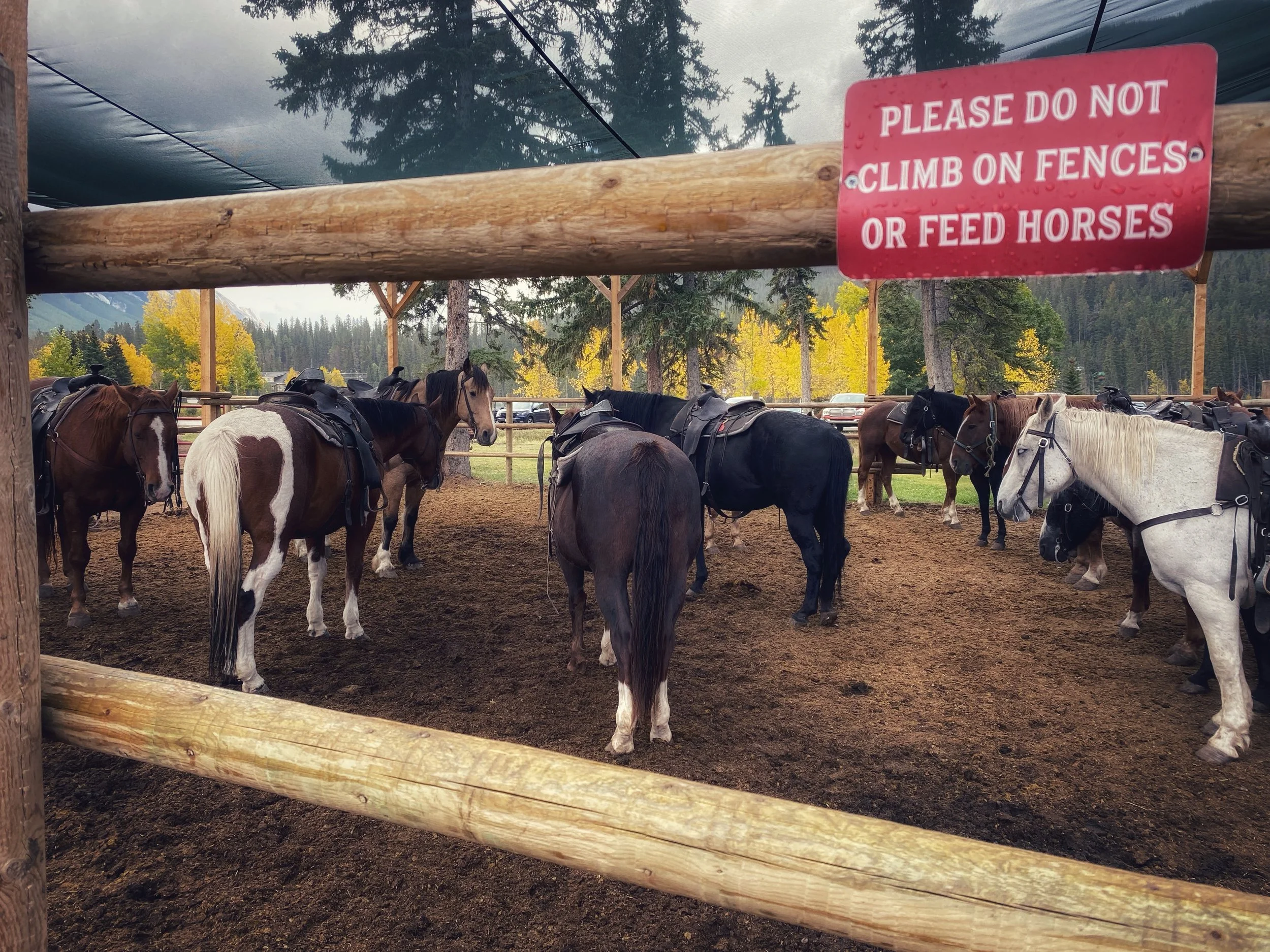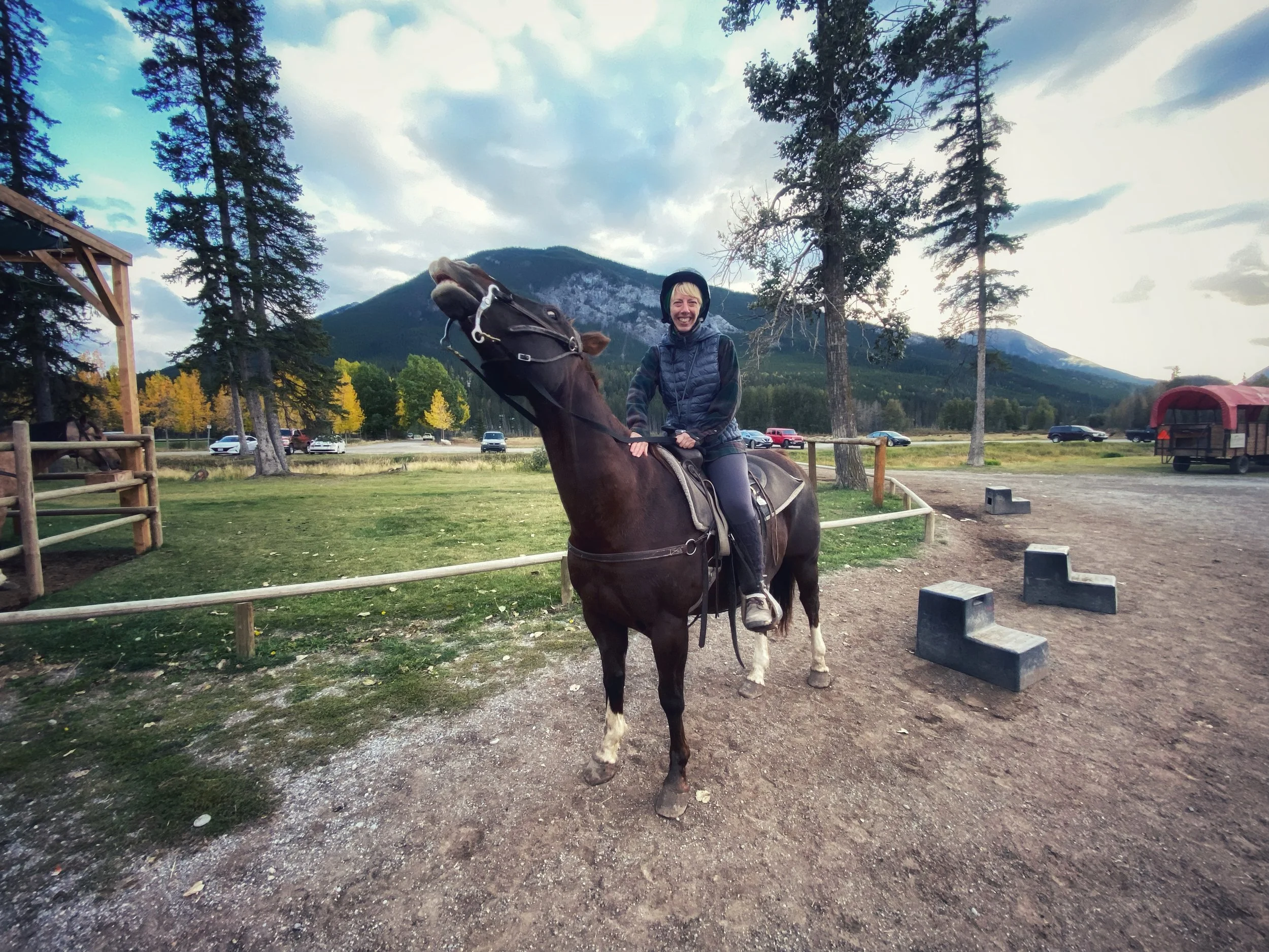 After lunch is when we split. Zeb dropped me off at Banff Trail Rides and I did a horseback trail ride with a cowboy style cookout! It was really fun! My horse was named Latte and had a bit of an attitude. On the way out we were second horse and he just wanted to moosy along! Then he we trot to catch up, lol. We climbed and defended hills, saw amazing scenery, and heard interesting stories about how Banff came into being. Once we arrive at Three Mile Cabin I attempted to lasso, but without success!! The meal was amazing!! The steak was DELICIOUS!! So was the garlic butter & cornbread muffins. Topped with hot apple cider! Yummmm….